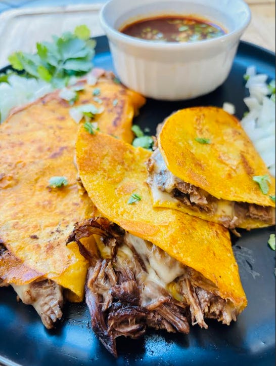 Quesabirria tacos! (Meredith: I’m on my way!) Since the weather is cooler right now, it’s the perfect time for these melt-in-your-mouth beef and cheese tacos dipped in consommé. And margaritas, of course!
