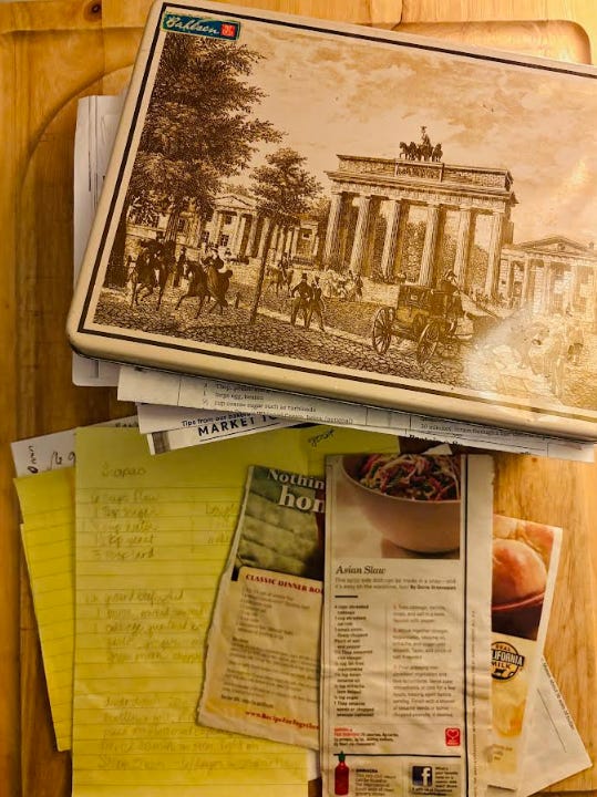 Oh dear. I’m not very organized when it comes to this. That is part of why I started a food blog and a Substack newsletter: so I could have my favorite recipes all in one place! For many years, I clipped out or handcopied my favorites and put them in an old Bahlsen cookie tin (which I still have and which still contains some favorite recipes!).